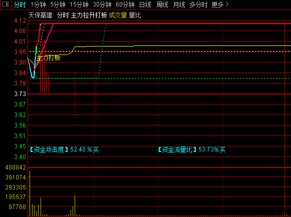 【主力拉升打板】分时主图指标,当资金攻击度超80%且突破压力线时,配合3%以内振幅结构判断涨停!