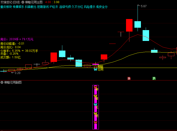 -买入信号标注:当满足买入条件时,主图会以醒目的颜色标注K线,并显示“柳暗花明”文字提示。