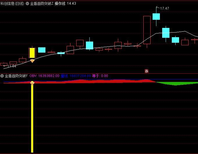 当主图出现黄色柱状线和图标,且副图OBV线同步突破时,表明趋势启动的概率较高,此时可以积极介入。